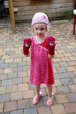 Ze wilde ook graag naar buiten maar aangezien het een beetje fris was waren de wantjes en muts lekker tegen de kou volgens haar. Dat ze dan vervolgens met korte mouwen en op haar (levensgevaarlijke) kleppertjes rondliep was verder geen probleem.