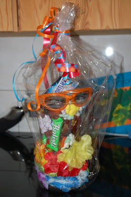 Een glazen vaas vol met lekkere snoepjes, balisto en kauwgom. Versierd met een "flikker"bril en een hawaiketting!