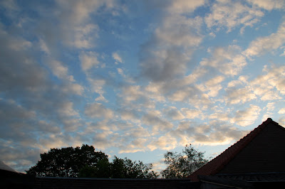 Maar goed, deze foto nam ik net een kwartiertje geleden. Prachtige luchten, doet me denken aan mijn vader, ook zo'n heerlijke prachtige vent die hoop ik nu op een van die wolkjes mee zit te gluren, zijn kaart bij zijn foto ziet en dan grinnikt:"Ik zei toch dat je niet in de volle zon moet verven jongen!"